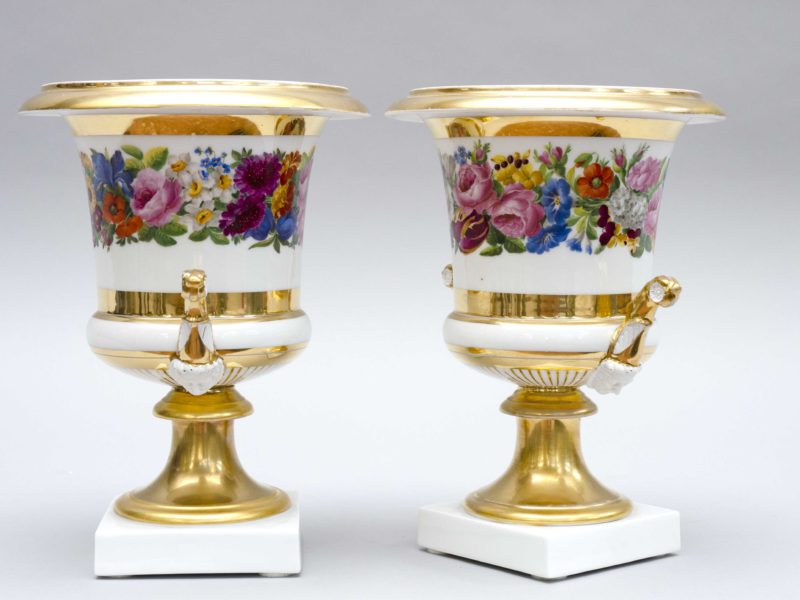 Lit: Meissen a été fondée en 1710 dans le château gothique d’Albrechtburg. C’était le premier fabricant de porcelaine en Europe. L’année précédente, à Dresden, l’alchimiste Johann Friedrich Böttger, «faiseur d’or» et prisonnier d’Auguste le Fort (Electeur de Saxe et roi de Pologne) avait fait la découverte du secret de la porcelaine de pâte dure. Initialement, l’usine fabriquait du grès fin dit du « rouge de Böttger », avec des reliefs et des motifs gravés. La première vraie porcelaine, mise sur le marché en 1713, était de style similaire à celle de Chine. A partir de 1720, la porcelaine devient blanche brillante, les couleurs de l’émail sont améliorées, les dessins sont de fantastiques « chinoiseries »; C’était l’époque des peintres-décorateurs avec J. G. Höroldt comme leader. Dans les années 1730, sous la direction du comte Brühl (jusqu’en 1752), les sculpteurs, avec J.J. Käendler à leur tête, sont dominant, produisant une gamme de personnages, d’animaux et d’oiseaux, des services à dîner richement décorés en relief, sans oublier les vases et l’art de la table. De 1756 à 1773, la porcelaine de meissen est marquée avec les épées croisées au point entre les poignées. Cette période marque la transition vers le style néoclassique. En 1774, le comte Camillo Marcolini devint directeur, il occupera ce poste jusqu’en 1814. Le style néoclassique plus sobre dominera mais la manufacture décline en raison des pressions économiques et de la concurrence internationale de la manufacture française de Sèvres. Au début du 19ème siècle, des innovations techniques sont introduits et les blancs sont moulés dans le goût populaire contemporain ce qui améliorera la situation. En 1830, le nom passe de Königliche Manufaktur à Staatliche Porzellan Manufaktur. Les superbes modelages et peintures sont caractéristiques de la porcelaine de Meissen et, au cours des 50 années suivantes, sa production fût inégalée, largement exportée et souvent imitées. Tout au long du XIXe siècle, la qualité de Meissen reste inchangée et il y aura peu d’innovations, bien que la fin des années 1890 et le début des années 1900 aient marqué le début d’une approche plus inventive de l’Art nouveau. Meissen est toujours opérationnelle aujourd’hui.