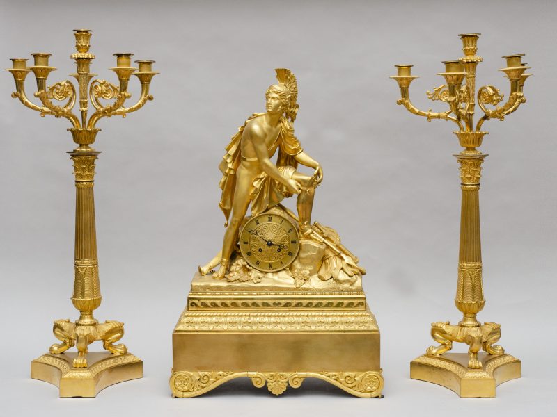 Contacteer onsBoogpendelklok met skeletuurwerk van het einde van de 18de eeuw. Zichtbaar uurwerk van geciseleerd en verguld brons; het toont vijf polychroom geëmailleerde wijzerplaten, wat een zeldzaamheid is. Bovenaan geeft een wijzerplaat de zonnefasen aan. In het midden, een wijzerplaat met de uren en minuten, twee kleine wijzerplaten voor de maanden van het jaar en de dag van de week. Onderaan, de maanfasen. Witte marmeren voetstuk met messing parel fries ondersteund door vier schaatsen.