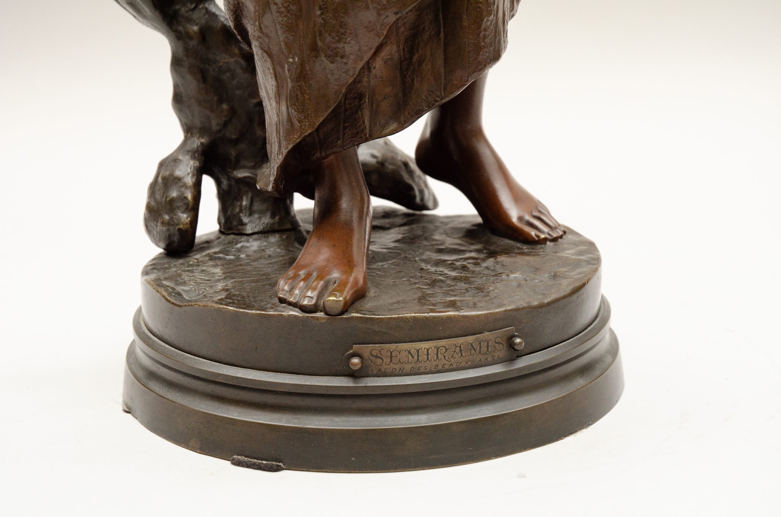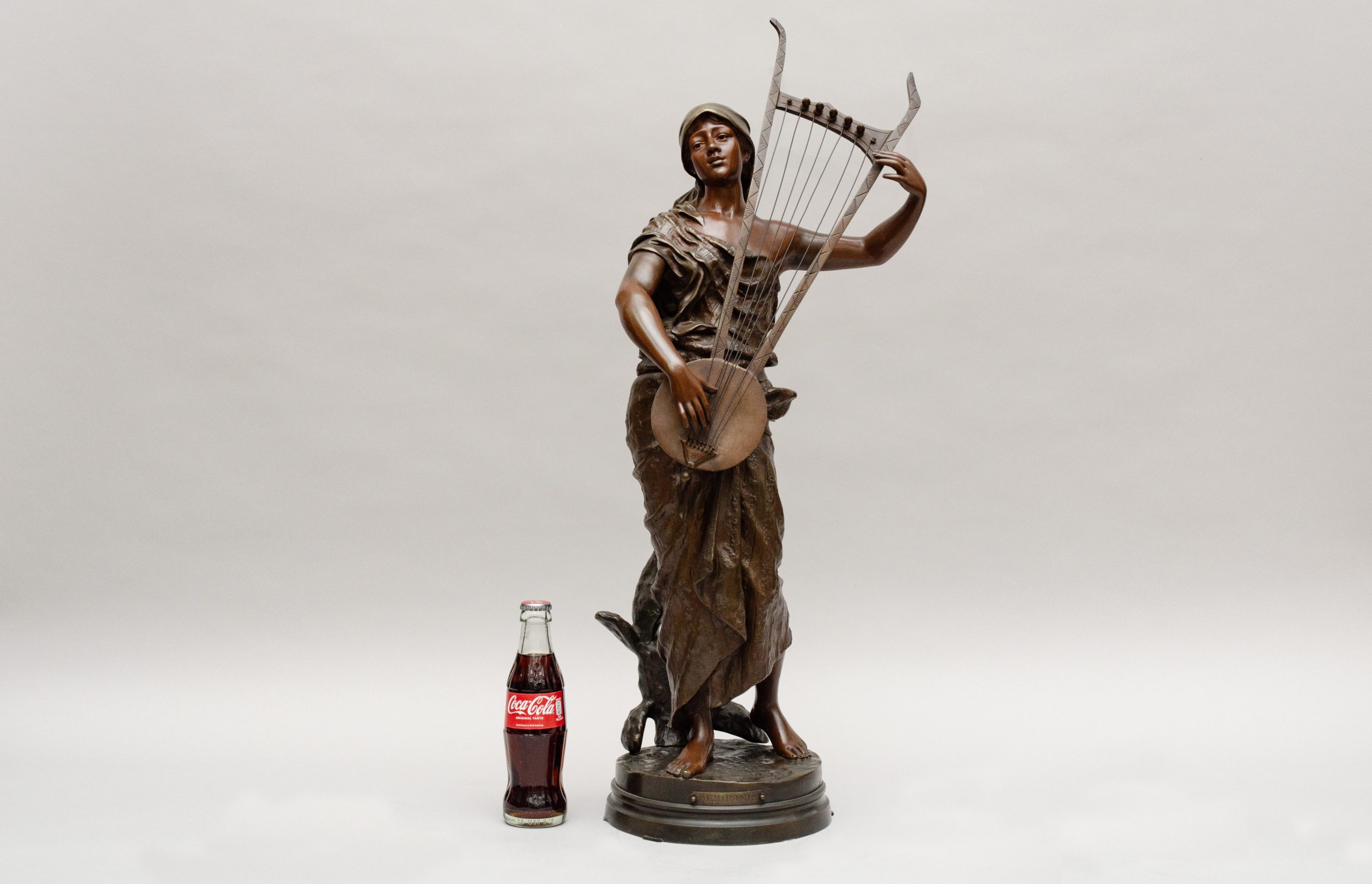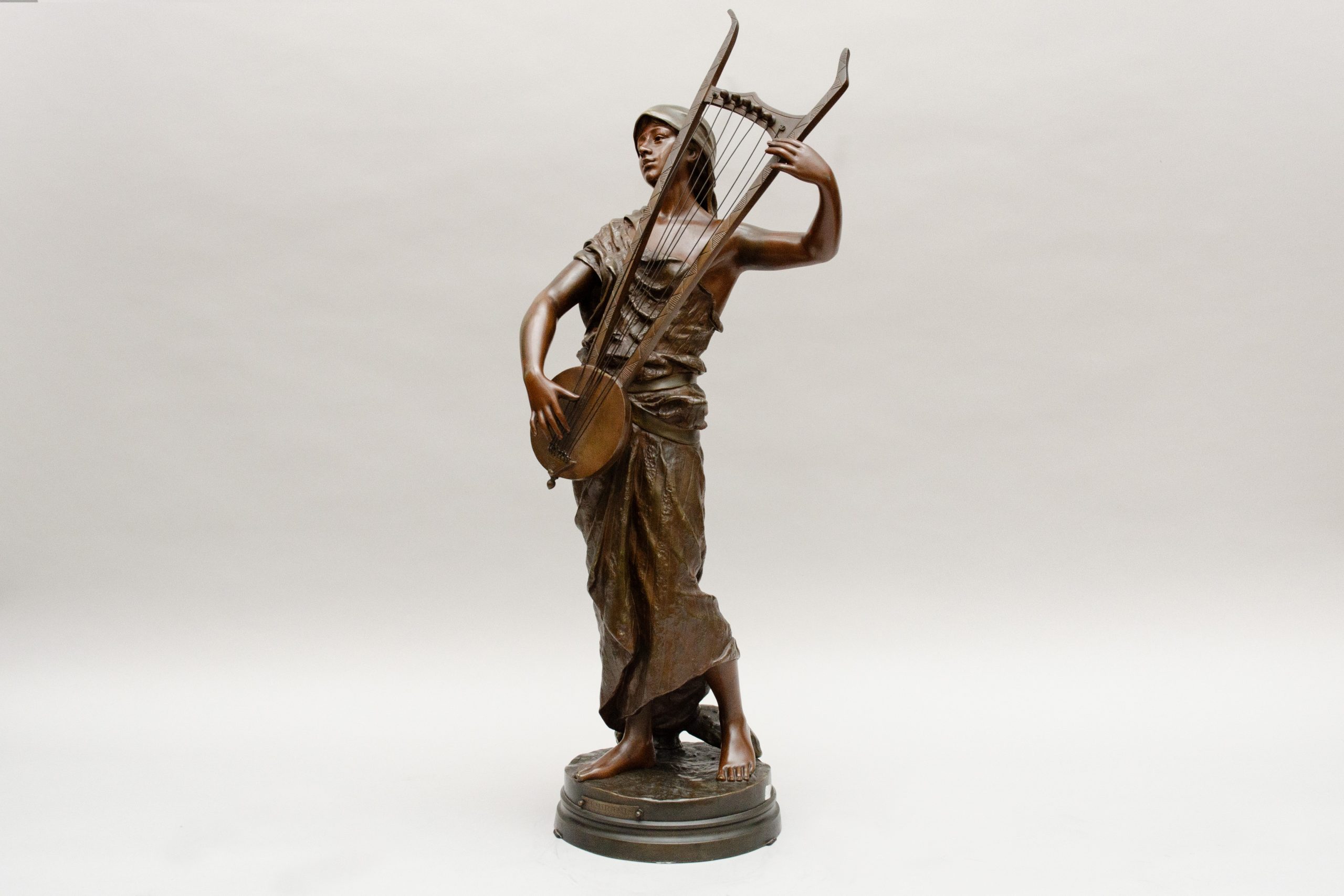 Bronze entitled “Sémiramis” ,a legendary queen of Babylon playing an oriental lyra. Bronze with different brown sheens.Signed on the terrace and marked for the smith “Société des bronzes de Paris”.