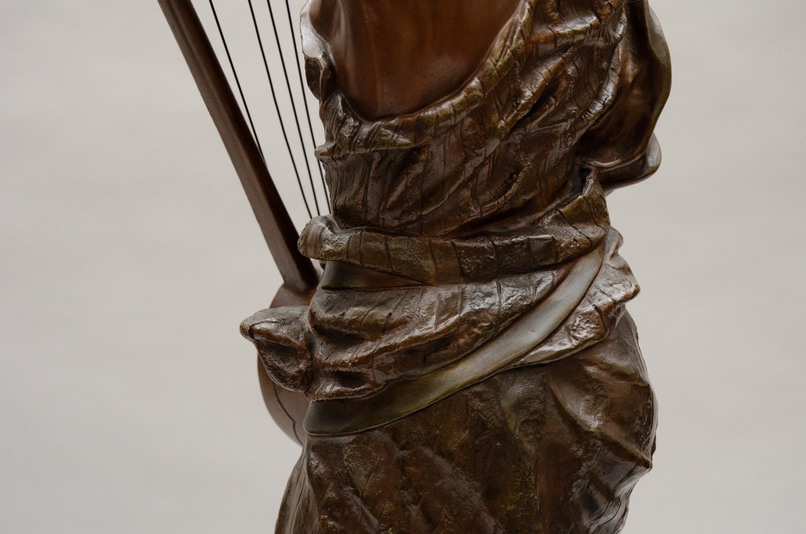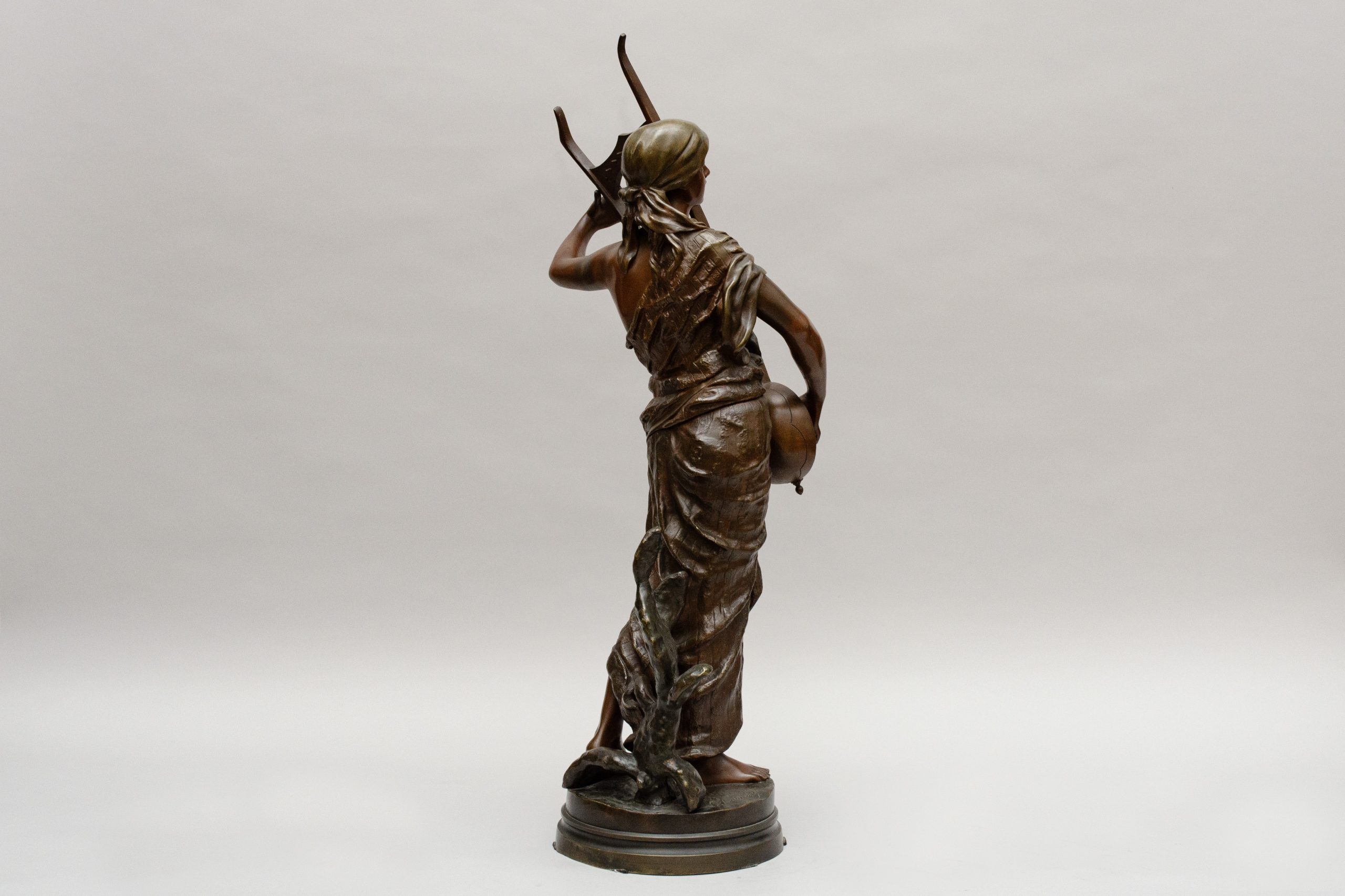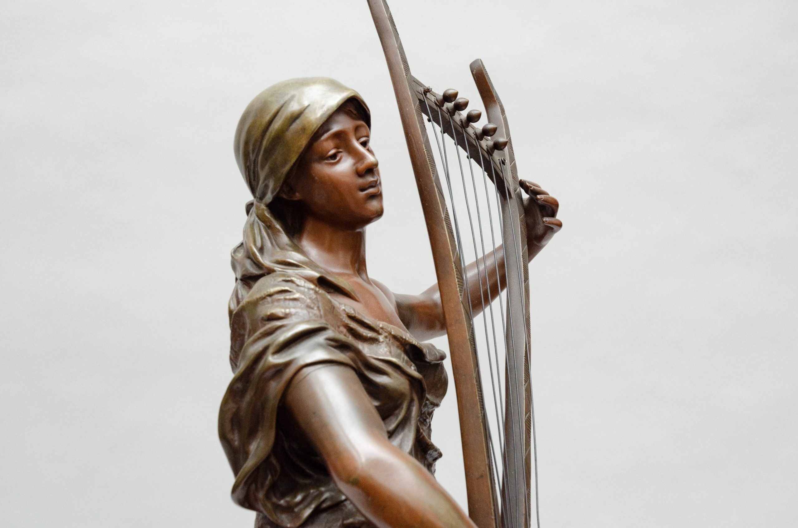 Bronze entitled “Sémiramis” ,a legendary queen of Babylon playing an oriental lyra. Bronze with different brown sheens.Signed on the terrace and marked for the smith “Société des bronzes de Paris”.