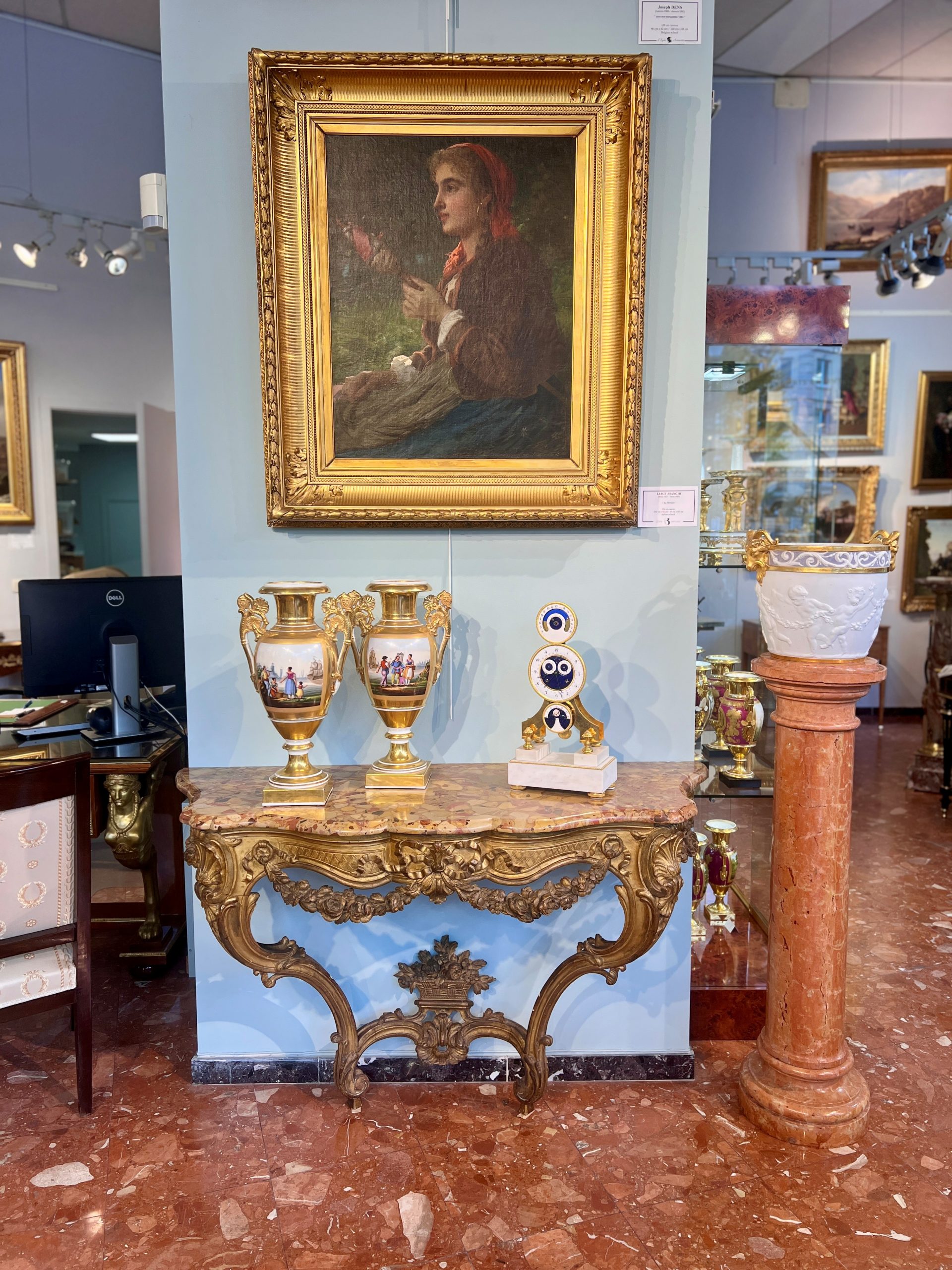 Very large and decorative pair of egg-shaped vases with on one side fishermen standing at the water with sailboats in the back. On the other side, landscapes. Exuberant handles in volute and lion masks in perfect condition! The entire vases are covered in gold. No marks. Very good condition.